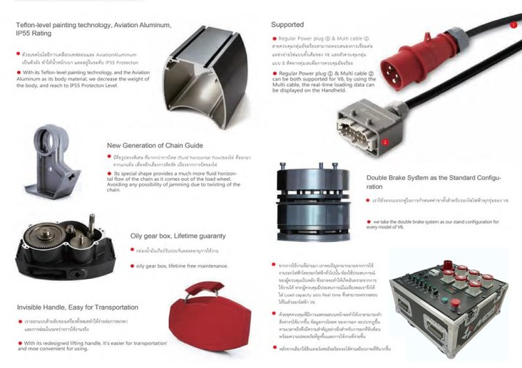 • น้ำหนักยก 1 ตัน พิกัดยก 25 เมตร น้ำหนักรอก 44 กิโลกรัม ได้รับรองมาตรฐานสากล CE FCC