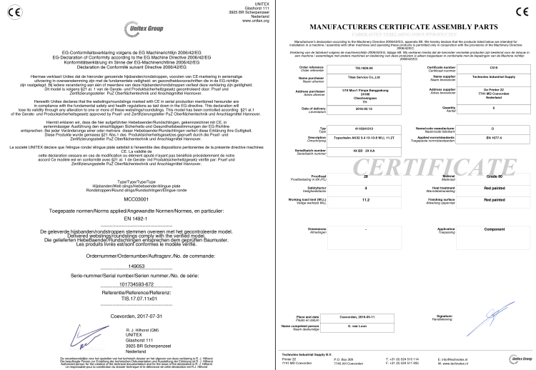 • มาตรฐานการผลิต Conformite Europeene (CE), Vinchotte (VGS), Berufsgenossenschaft (GS)